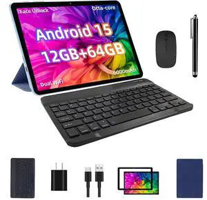 TUOHAITIME Android 15 Tablet, 12GB+64GB+1TB Expand, 10 Tablet Bundle with Keyboard Case, Stylus Pen, Octa-core CPU, Dual Camera, WiFi6, 6000mAh Battery+18W Fast Charge, Support Face Unlock,Blue