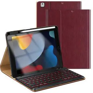 OPAKIT Leather Keyboard Case for iPad 9th/8th/7th Generation 10.2 inch, iPad Pro 10.5-inch Air 3rd Case with Pencil Holder, 7 Color Backlight BT Keyboard (2021/2020/2019/2017), Wine