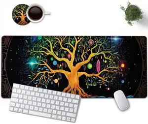 Large Mouse Pad, 31.5 x 11.8in Extended Gaming Mouse Pad with Stitched Edges, XXL Mousepad Protector Non Slip Rubber Base for Office and Home Writing Mat, Colorful Tree of Life Pattern Black Desk Mat