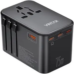 Universal Travel Adapter, VINTAR 75W GaN International Power Adapter with 3 USB C PD and 2 USB A QC, All in One Travel Essentials for UK/EU/USA/AUS, Travel Adapter Worldwide for Laptops Tablets Phones