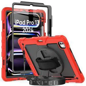 Herize Case for iPad Pro 13 7th Generation with Screen Protector ^^ Case Compatible with iPad 13 Inch for Kids Girls Boys ^^ Shockproof Rugged Protective Cover W/Stand Hand Grip Shoulder Strap ^^ Red