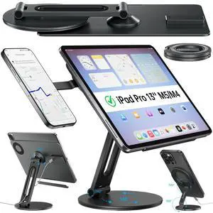 Aioopro 2-in-1 Magnetic Wireless Charging Stand for iPad Pro 13" M4/M5 & Magnetic Phone Holder for iPhone 17-12, 360 Rotating 180 Foldable Aluminum Tablet Stand for Desk with 1M USB Cable