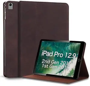 Gexmil Case for iPad Pro 12.9 Inch,2nd/1st Generation(2017/2015) Genuine Leather Cover Anti Fingerprint/Slip,Cowhide Folio Cover Auto Sleep/Wake with Adjustable Stand,Sand Dark Brown