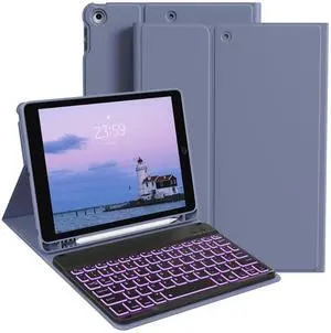 JKSML Keyboard Case for iPad 9th/8th/7th Generation 10.2 Inch 2021/2020/2019, 7 Colors Backlit Wireless Detachable Folio Keyboard Cover Thin & Light with Pencil Holder, Auto Wake Sleep (Purple)