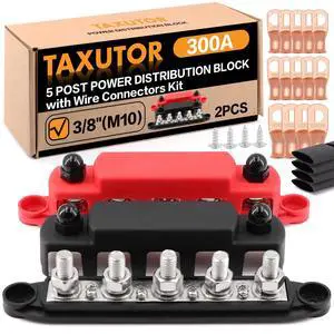 Taxutor 300A Bus Bar 5 Post, 3/8" Stud Heavy Duty Power Distribution Block with Cover, for Solar Marine RV Van Camper Car Audio, Includes Copper Lugs & Heat Shrink (Red & Black)