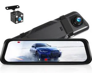 CAMECHO Mirror Dash Cam 9.66 inches 1080P Rear View Mirror Camera with HD Front and 4-LED Backup Camera, IPS Touch Screen, Night Vision, Wide Angle, Loop Recording, Parking Assist