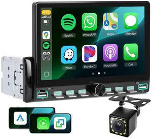 [4+64G] Android 13 Single Din Car Radio Stereo with Wireless Carplay & Android Auto,7'' Flip Out Touch Screen Car Radio with Mirror Link GPS WiFi FM/RDS Bluetooth EQ DSP USB Music/Fast Charging