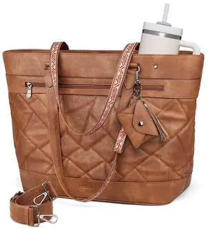 FADEON Quilted Tote Bag for Women, Designer Laptop Purse with Compartments, Large Leather Shoulder Handbag for Travel, Work, Daily, Teacher Brown