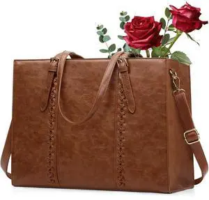 RAINSMORE Laptop Bag for Women, 15.6 inch Laptop Tote Bag PU Leather Computer Work Bag Lightweight Shoulder Handbags, Brown