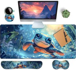 HaoSiTeck 4-Piece Extended Large Mouse Pad Set for Women Men with Turtle Anime Design Includes 35.4 x 15.7 XXL Large Mouse Pad Keyboard Wrist Rest Mouse Wrist Support and Coaster for Office Home
