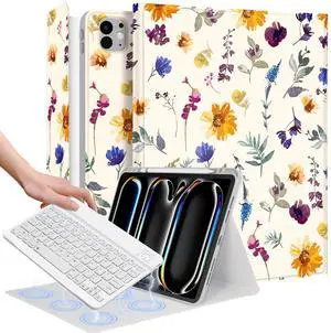 Wazzasoft for iPad Pro 13 inch Case with Keyboard M4 - Pencil Holder Folio Women Girls Cute Kawaii Strawberry Unique Design for Apple Tablet Cover Pro 13 2024, Color Flower