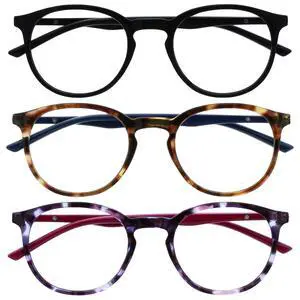 OPULIZE MET Blue Light Blocking Reading Glasses for Women Men, Slim Round Frame with Scratch Resistant and Spring Hinges, Computer Glasses with Anti-Reflective, Black,Brown,Purple +1.5 (Pack of 3)