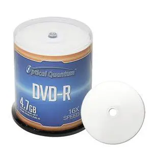 Optical Quantum DVD-R 4.7GB 16X White Inkjet Printable Hub Printable - 100pk Cake Box (FFP), 100 Discs