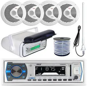 Single DIN MP3 USB SD Bluetooth in-Dash Radio Receiver Bundle Combo with White Marine Stereo Housing + 4X 6.5 Dual Cone Waterproof Audio Speakers = Enrock Flex AM/FM Antenna + 50Ft Speaker Wire