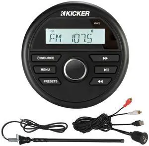 Kicker KMC2 Marine Gauge Style AM/FM Radio Stereo Receiver Media Player Bundle Combo With Enrock USB/AUX To RCA Interface Mount Cable, 45" Radio Antenna Mast
