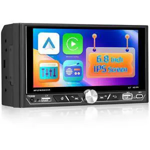 EKAT Double Din Stereo with Wireless Carplay and Android Auto - 6.8 Inch HD Touch Screen Car Audio Receivers with EQ/Mirror Link/FM/AM RDS Radio/USB/Fast Charging/SWC + Rear View Camera