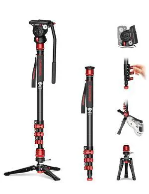 IFOOTAGE Cobra 3 Monopod with Fluid Head C180F-P + K5S, Carbon Fiber Monopod with Feet for DSLR Cameras - Canon, Nikon, Sony, Olympus, Panasonic - Maximum Height 71" - Payload 17.64Lbs/8KG