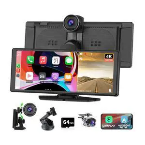 Pyniro Portable Wireless CarPlay Screen with 4K Dash Cam & 1080P Rear Camera, IPS Touchscreen Car Stereo Supporting CarPlay, Android Auto, GPS, Bluetooth, Mirror Link & AirPlay