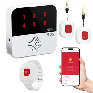Life Alert Systems for Seniors No Monthly Fee, App-Controlled Caregiver Pager, LED Number Display 1Waterproof Wrist Remote Control 2Call Button 1Receiver(Only Supports 2.4GHz Wi-Fi)