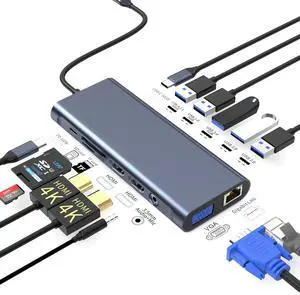 14 in 1 USB C Docking Station Dual Monitor, Laptop Docking Station Triple Display, 2 HDMI, VGA, Ethernet, 6 USB C/A Ports, 100W PD, SD/TF, Mic/Audio, Compatible for MacBook, Dell, Lenovo, Surfacee