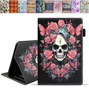 JDHJFBFJNP Case for Kindle Fire 7 Tablet (12th Generation, 2022 Release, 7" Display), PU Leather Stand Flip Cover with Card Slot & Pencil Holder, Skull Flower
