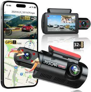 Juscar 2.5K+1080P Dual Dash Cam Front and Inside, WiFi & GPS Dash Camera for Cars with 32G Card, IR Night Vision, 3" IPS Screen, Inside Car Camera for Taxi Driver, Support 256GB Max, App Control