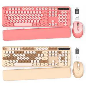 2 Pack Wireless Keyboard and Mouse Combo - Cute Typewriter Keyboard with Detachable Wrist Rest, Retro Round Keycaps, Foldable Legs, 2.4GHz Full-Size Keyboard for PC, Laptop, Windows