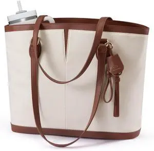 LOVEVOOK Tote Bag, Work Bags for Women with Large Cup Holder, Large Capacity Teacher Tote with Multi Pockets, Nurse Diaper Tote with Padded Laptop Compartment, 15.6 Inch Khaki Beige