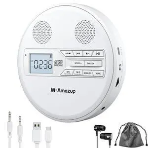 M-Amazup CD Player Portable, Rechargeable Portable CD Player with Dual Speakers and Anti Skip,CD,Dual Bluetooth,FM Transmission,USB,AUX,LCD Display,Sensitive Button,Repeat,10 Speeds for Home Car White