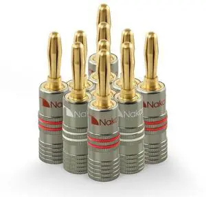 Nakamichi Ultimate Series 24K Gold Plated Beryllium Red Copper Banana Plug 12-18 AWG Gauge Size 4mm Connector for Speakers Wire Amplifiers Hi-Fi Sound Systems (16 Pcs (8-Pairs), Banana Plugs)