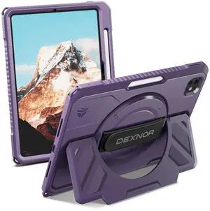 Dexnor for iPad Pro 11 inch Case M5 2025/M4 2024, Rugged Protective Case with 360 Rotating Hand Strap & Large Steady Stand & Screen Protector & Pencil Holder Shockproof Full-Body Bumper Cover, Purple