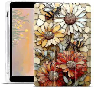 AdorableWhimsy Cute Flower & Bee Case for iPad Air 11" M3 2025/M2 2024/iPad Air 5th/4th 10.9" 2022/2020 Sunflower Aesthetic Design Foldable Leather Protective Case Soft Back Cover with Pencil Holder