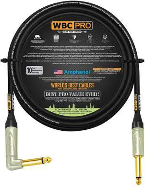 20 Foot - WBC-PRO-Guitar 20 AWG - Low-Cap (18pF/ft) Pro-Grade Graphite-Based - Dual-Shielded Guitar, Bass, Instrument Cable with Neutrik Angled to Angled Inch (6.35mm) Gold TS Connectors