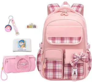 5Pcs Pink Backpack for School Girls - Kids Schoolbag for Elementary School Kawaii Bookbag for Cute Plaid Girls Daypacks for Students Teen Kids Casual Travel Bag (Pink Plaid)