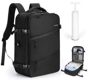 HOMIEE Travel Backpack with Vacuum Compression Space Saving Storage Bags and Hand Pump, 18x14x8 inches Carry on Personal item Bag, Black