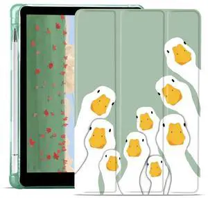 JOYLAND Cartoon Doubt Ducks Pad Case for 10.2 Inch iPad 9th/7th/8th Generation with Pencil Holder, Auto Wake/Sleep for iPad 2021/2020/2019 Cover, Foldable Smart Stand Green Leather Anti-Scratch Case