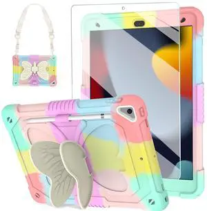 BLOSOMEET Pink Kids Case for iPad 9th/8th/7th Generation 2021/2020/2019 10.2 Inch with Tempered Glass Screen Protector & Butterfly Stand Cover for iPad 10.2 with Shoulder Strap Pencil Holder