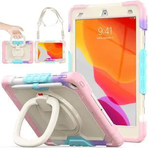 SEYMAC stock Shockproof Tablet Case for iPad 9th/8th/7th Generation 10.2 inch, Full-Body Drop Protection Case with Pencil Holder & [360 Ring Handle Stand] Screen Protector (Colorful Pink)