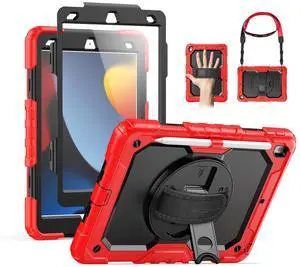 SEYMAC for iPad 9th/8th/7th Generation Case 10.2" 2021-2019, Full-Body Shockproof Heavy Duty Protective Case with Screen Protector, 360 Rotating Stand/Handle/Shoulder Strap for iPad 10.2 Inch, Red