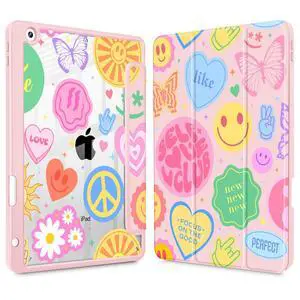 May Chen for iPad 9th Generation with Pencil Holder, iPad 8th/7th Gen Case 10.2-inch, [Penceil Holder] Trifold Stand Auto Wake/Sleep Clear TPU Protection Back Cover, Smile Art