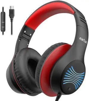 EarFun K3 Kids Headphones, USB Type C Over Ear Headphones with Microphones, 85/94dB Volume Limit, HD Stereo Sound with LED Light, Foldable Wired Headphones for School/Boys/Girls/Tablet, Black