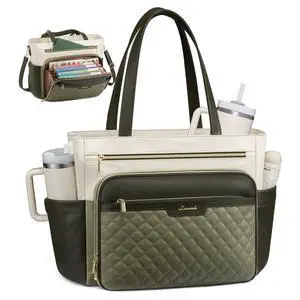 LOVEVOOK Teacher Tote Bag with Accordion File Pocket, Soft PU Leather Work Briefcase Quilted Laptop Bag with Large Cup Holder