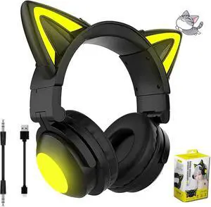 YIK TUNG Cute Cat Ear Bluetooth Headphones with Built-in Mic, Over Ear Wired Headphones with LED Lights, Foldable Wireless Headset with Cat Ear for Traveling, Gift for Boys Girls Teens Adult (Pink)