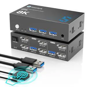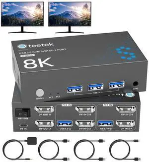 8K Displayport KVM Switch 2 Monitors 2 Computers, 8K@60Hz Dual KVM Switch for 2 Computers Sharing 2 Monitors, Keyboard, Mouse, Hard Drives, Printer, with EDID Adaptive, 2*USB Cables, and Controller.