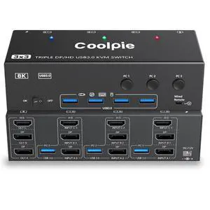 KVM Switch 3 Monitors 2 Computers 8K@60Hz 4K@144Hz,1*HDMI+2*DP in,3*HDMI Out,Triple Monitor KVM Switch with 4 USB 3.0 Ports for USB Devices,Wired Remote,12V Power Adapter and USB Cables Included
