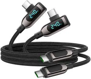 VisionSync 240W Right Angle USB C to USB C Cable [4ft/2Pack],Nylon Braided Type C Fast Charging Cable with LED Display for lPhone 16/15 Pro Max, Galaxy S25/S24 Ultra, MacBook, Laptop,Black