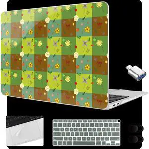MEEgoodo for MacBook Air 13.3 inch Case 2021 2020 2019 2018 A2337 M1 A2179 A1932, Laptop Shell for MacBook Air M1 with Keyboard Webcam Cover&Trackpad Film&Type C Adapter,Green Checkered&Nature Pattern