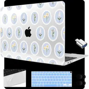 MEEgoodo for MacBook Air 13.3 inch Case 2021 2020 2019 2018 A2337 M1 A2179 A1932, Laptop Shell for MacBook Air M1 with Keyboard Webcam Cover & Trackpad Film & Type C Adapter,Spring Floral &Round Frame