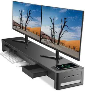 meatanty Dual Monitor Stand Riser with 2 Drawers,4 USB Ports and Charging Pad,Metal Monitor Stand for 2 Monitors Supports Transfer Data and Charging,Desk Organizer for PC,iMac(38.7 inches)