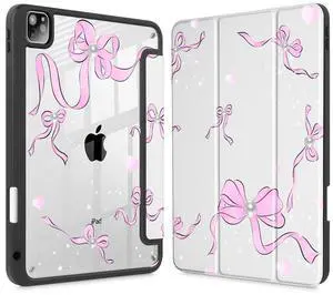 May Chen for iPad Pro 13 Inch Case M5 2025 / M4 2024, Built Pencil Holder & Clear Transparent Print Back Shell Slim Stand Shockproof Tablet Cover, Auto Wake/Sleep, Pearl Bow